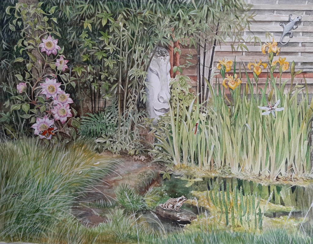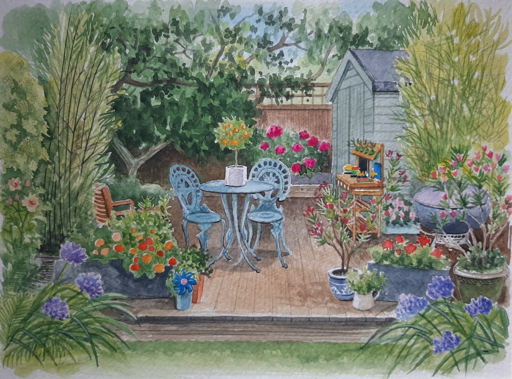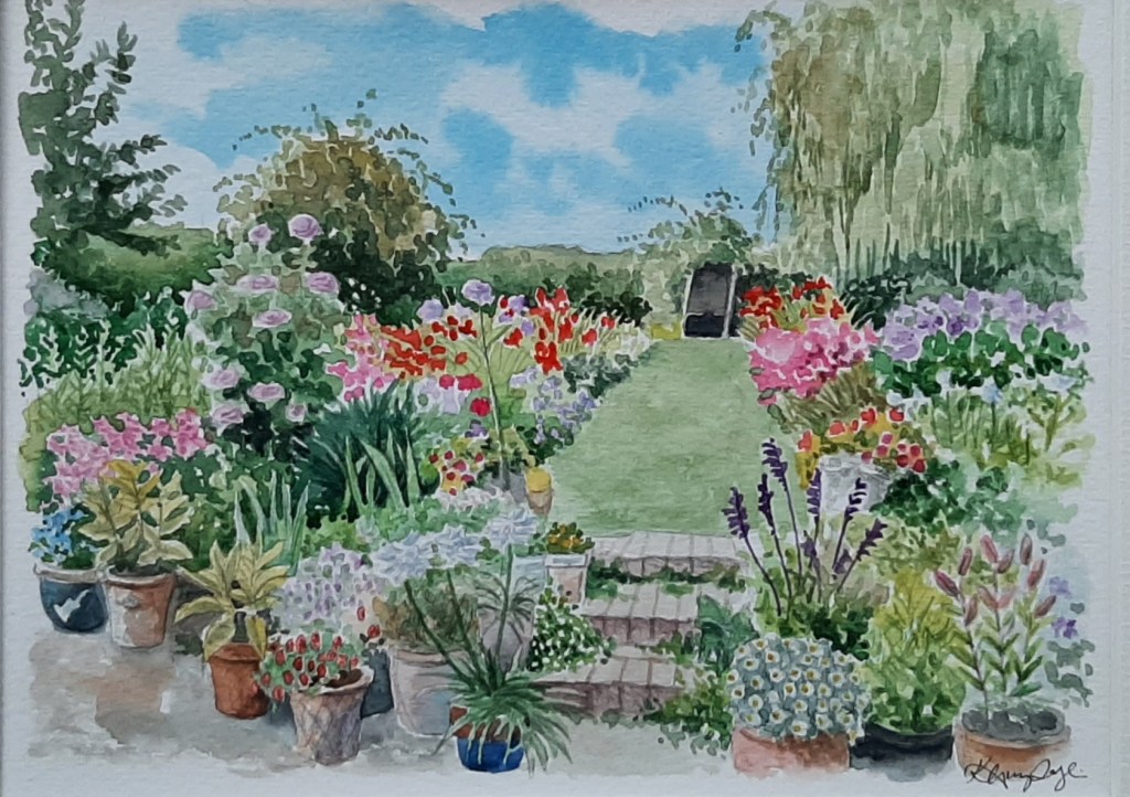 As a keen gardener myself I love to paint people’s gardens. Such a tranquil, colourful subject, and it feeds my curiosity (read; nosiness) as to what other people do with their plants and flowers. Gardens can be very personal spaces. Sometimes planned with precision, a dream garden with everything in its rightful place, or perhaps moulded and shaped over many seasons, guided by nature. Either way, they are always precious to their owners – a place to escape to after a busy day, a place to breathe fresh air and listen to the birds, a place to potter.